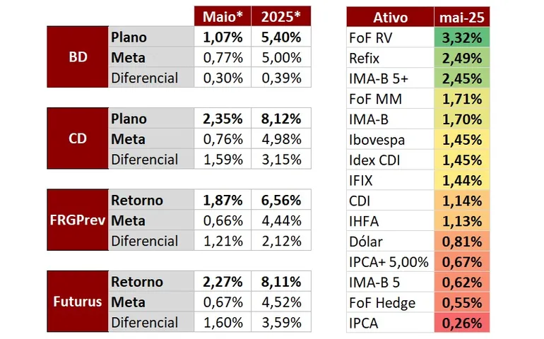 A Real Grandeza registrou, em maio, e nos cinco primeiros meses do ano, resultados superiores às metas atuariais e de investimentos em todos os planos previdenciários administrados. O desempenho se deve, em parte, a uma melhora geral no cenário doméstico, com valorização do Real, das ações em Bolsa e dos títulos públicos, mas a performance das carteiras superou até mesmo os índices de referência de mercado.