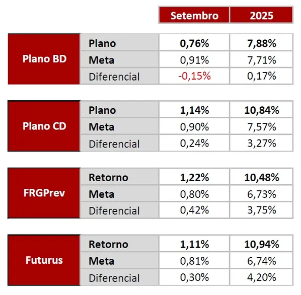 Os Planos Futurus, FRGPrev e CD, nessa ordem, ultrapassam suas metas com folga, em mais de 3%, entre janeiro e setembro deste ano.