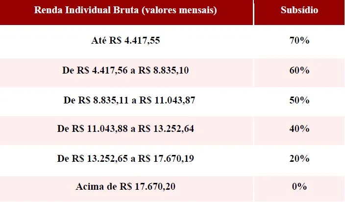 O benefício é praticado através de descontos escalonados sobre a mensalidade do plano, de acordo com a renda autodeclarada anualmente, a fim de demonstrar a situação de vulnerabilidade socioeconômica. Veja a seguir: