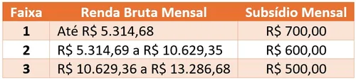 A principal mudança aprovada é a reformulação da tabela de subsídios. A partir de 1º de julho, o programa passa a operar com valores fixos por faixa de renda, em substituição aos percentuais anteriormente aplicados. Além disso, os subsídios serão direcionados exclusivamente às três primeiras faixas de renda, conforme descrito na tabela abaixo: